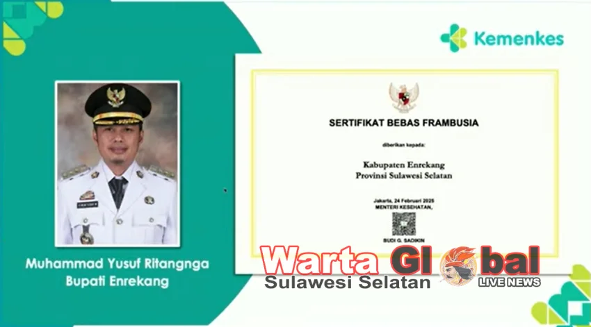 Enrekang, Warta Global.id - Pemerintah Kabupaten Enrekang menerima sertifikat Bebas 2025 Frambusia dari Kementrian Kesehatan, Rabu, 20 Agustus 2025. Penyerahan ini dilakukan secara daring.