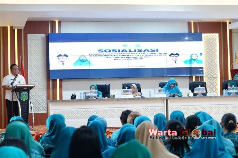 Lutim, wartaglobalsulsel.id - Dalam upaya meningkatkan kemandirian dan kesejahteraan keluarga melalui penguatan ekonomi berbasis koperasi, Tim Penggerak Pemberdayaan dan Kesejahteraan Keluarga (TP PKK) Kabupaten Luwu Timur melaksanakan kegiatan Sosialisasi Pembentukan Koperasi PKK di Aula Sasana Praja Kantor Bupati, Rabu (22/10/2025).
