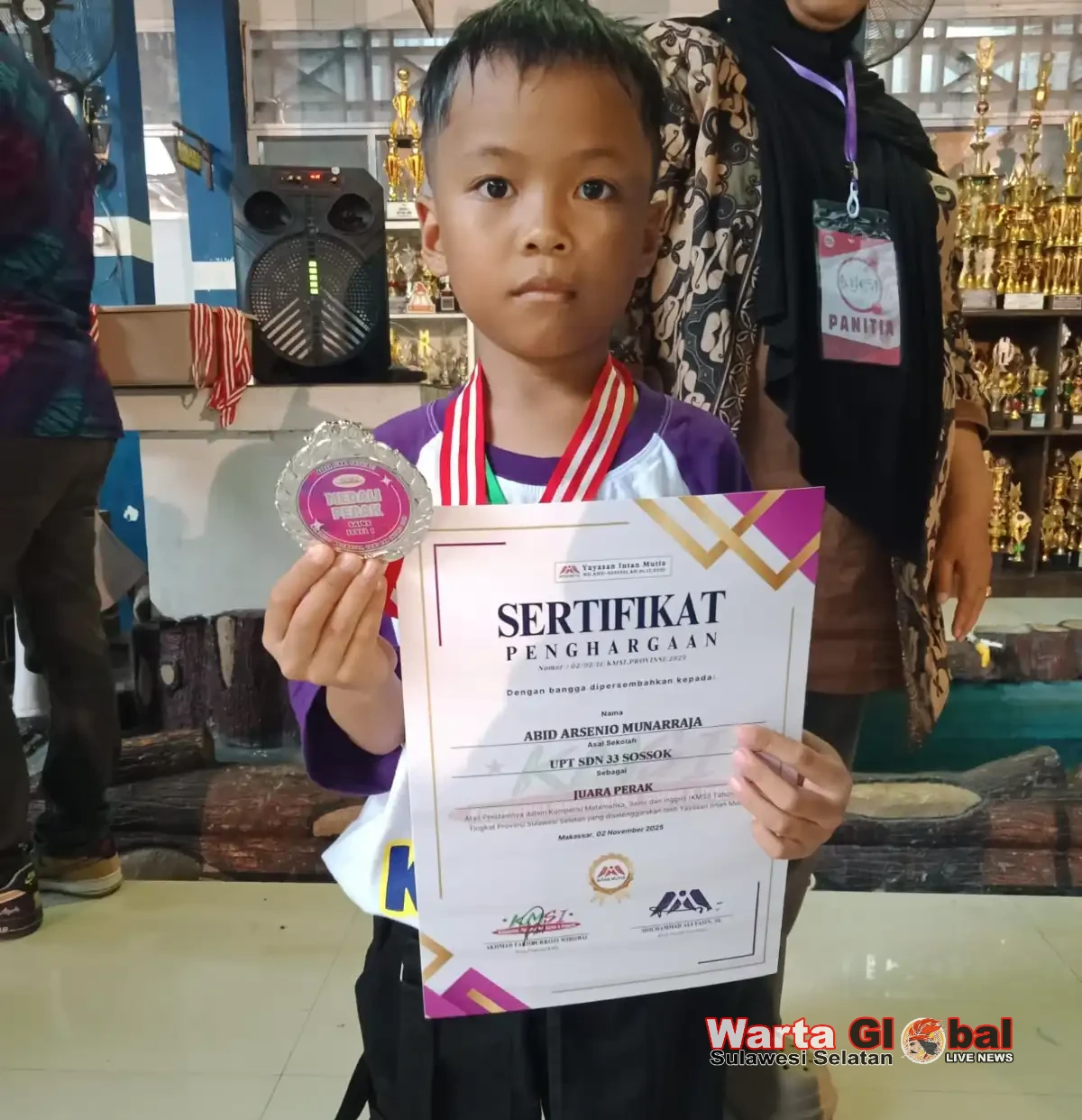 Enrekang , Warta Global.id – Prestasi membanggakan kembali ditorehkan oleh salah satu siswa asal Kabupaten Enrekang. Adalah Abid Arsenio Munarraja, siswa kelas 2 SD Negeri 33 Sossok, Kecamatan Anggeraja, yang berhasil meraih Juara 2 (Medali Perak) dalam ajang Kompetisi Matematika Sains Inggris (KMSI) tingkat Provinsi Sulawesi Selatan.